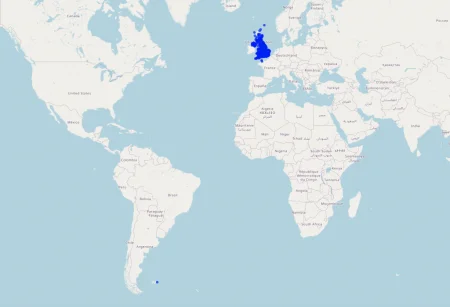 The map opens in a zoomed out view revealing a parkrun in the Falkland Islands which is 12333 km away from… Land’s End in England!