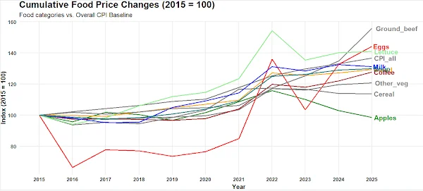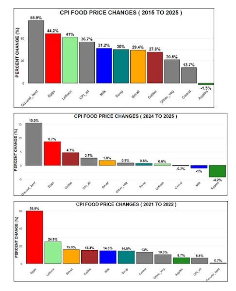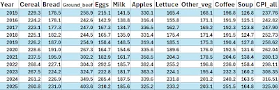 For 2025 compared with 2015, I was not aware how much the prices had risen for ground beef, lettuce, and eggs.