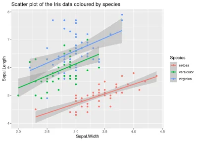 complicated_plot = ggplot(iris) + aes(Sepal.Width, Sepal.Length, colour = Species) + geom_point() + geom_smooth(method = "lm") complicated_plot
