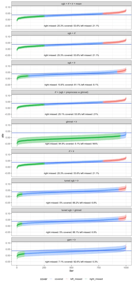 Wow, not too shabby! Indeed when we went from cv5 to cv10, we have reduced bias and slightly increased variance! How about that. Everything except gam + lr, which make sense because we don’t really tune them. Though that being said, I wonder what’s under the hood that controls the knot for gam in superlearner. Will need to check that out. With this, it looks like tuned xgboost + lr might have the best numbers. Well, now we’ve seen bias and variance, what about coverage?