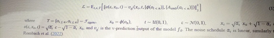 We now train a generative diffusion model conditioned on the agent’s trajectories Tagent (actions and observations) collected during the previous stage. We re-purpose a pre-trained text-to-image diffusion model, Stable Diffusion v1.4 (Rombach et al., 2022). We condition the model fθ on trajectories T ∼ Tagent, i.e. on a sequence of previous actions a<n and remove all text conditioning. Specifically, to condition on actions, we simply learn an embedding Aemb from each action (e.g. a specific key press) into a single token and replace the cross attention from the text into this encoded actions sequence. In