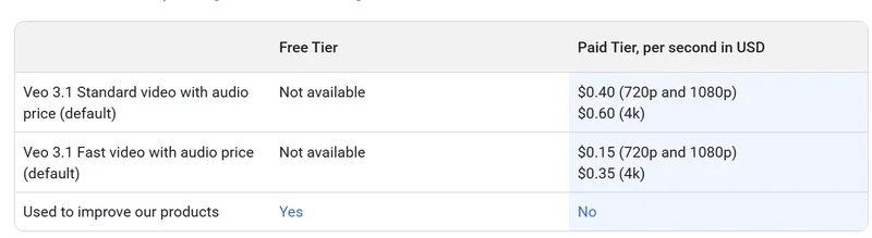 Usage for product improvement: Free tier videos are used by Veo to improve their models; Paid tier is fully for your own processing